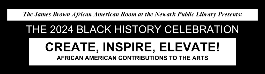 The James Brown African American Room is proud to present our 2024 Black History Celebration. This year’s theme, Create, Inspire, Elevate: African American Contributions to the Arts, reflects a rich and dynamic exploration of the profound impact the Black and African American communities have had on various forms of artistic expression. This theme not only pays homage to the historical significance of African American contributions but also highlights the ongoing and evolving influence within the arts and shines a special spotlight on Newark and New Jersey artists.
