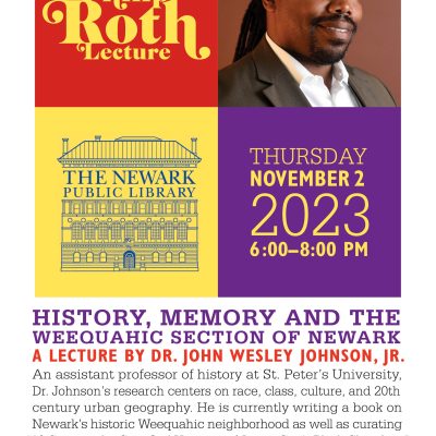 The Newark Public Library cordially invites you to join us for The 2023 Philip Roth Lecture: History, Memory, and the Weequahic Section of Newark by Dr. John Wesley Johnson, Jr.