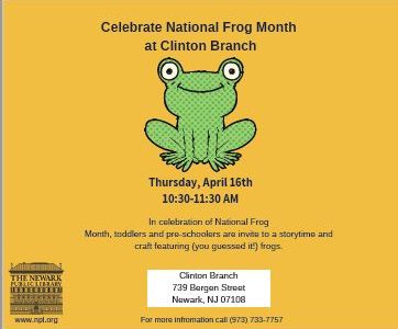 Thursday, April 16th, 2020 | 10:30-11:30 AM The Newark Public Library, Clinton Branch | 739 Bergen Street, Newark, NJ 07108 In celebration of National Frog Month,... Read More