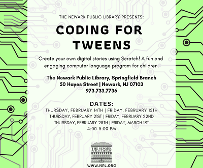 Join us at The Newark Public Library’s Springfield Branch for Coding for Tweens!
