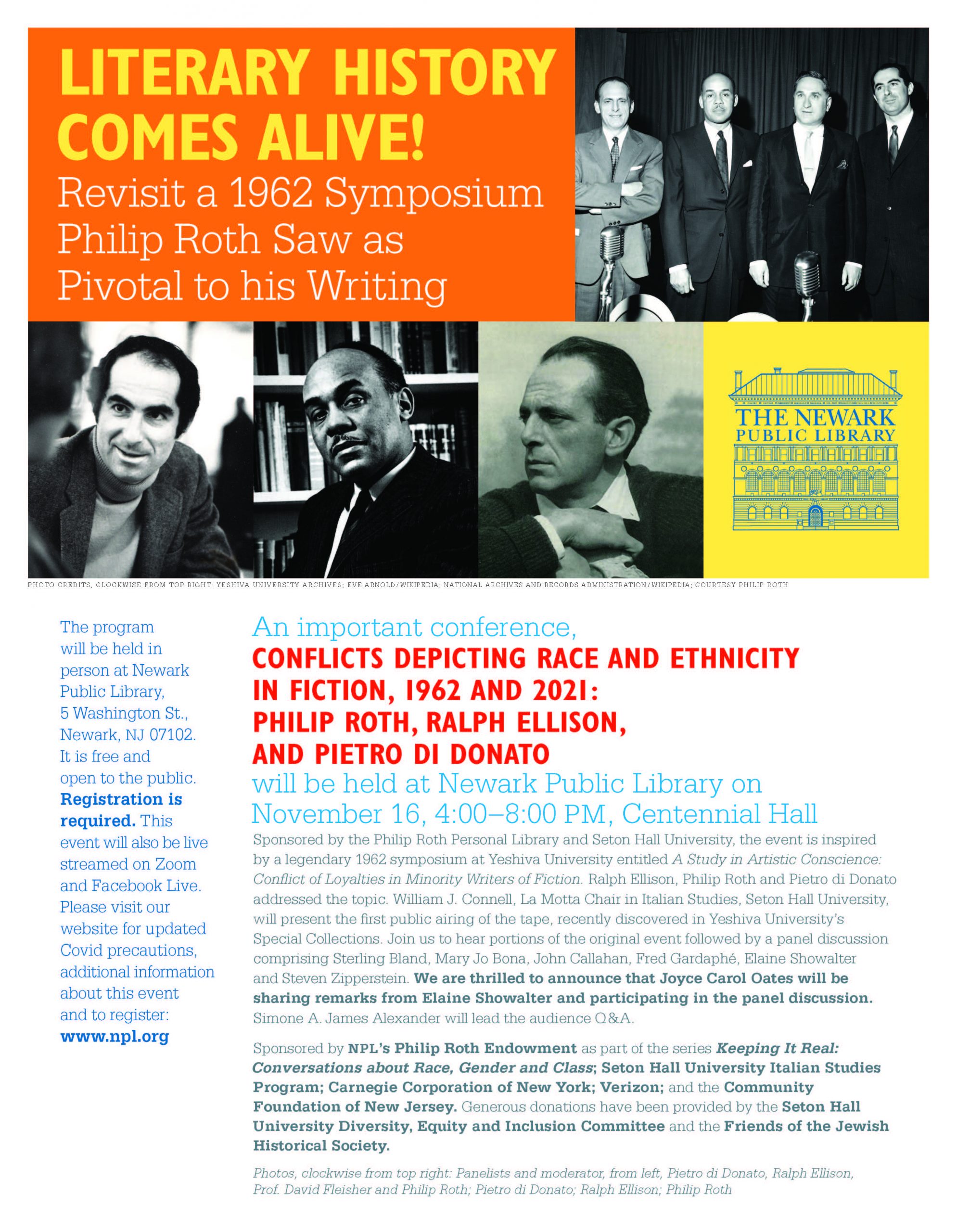 An important conference, Conflicts Depicting Race and Ethnicity in Fiction, 1962 and 2021: Philip Roth, Ralph Ellison, and Pietro di Donatowill be held at Newark Public Library on November 16, 4:00–8:00 PM, Centennial Hall Sponsored by the Philip Roth Personal Library and Seton Hall University, the event is inspired by a legendary 1962 symposium at Yeshiva University entitled A Study in Artistic Conscience: Conflict of Loyalties in Minority Writers of Fiction. Ralph Ellison, Philip Roth and Pietro di Donato addressed the topic. William J. Connell, La Motta Chair in Italian Studies, Seton Hall University, will present the first public airing of the tape, recently discovered in Yeshiva University’s Special Collections.