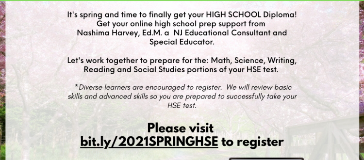 It’s spring and time to finally get your HIGH SCHOOL Diploma! Get your online high school prep support from Nashima Harvey, Ed.M. a NJ Educational Consultant and Special Educator.