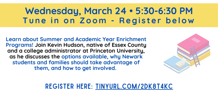 Learn about Summer and Academic Year Enrichment Programs! Join Kevin Hudson, native of Essex County and a college administrator at Princeton University, as he discusses the options available, why Newark students and families should take advantage of them, and how to get involved.