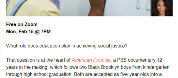 Before we meet, we’ll screen the PBS documentary American Promise, which explores how Black children, and in particular, Black boys, are educated, and what impact systemic racism has on their experience in the classroom and beyond.