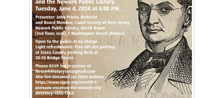 First published in 1835 by B.T. Pierson, Newark City Directories are a goldmine of information for historical and genealogical researchers, with personal listings, business descriptions, and period ads charting Newark’s 19th century growth. John Prieto will discuss Pierson’s early life and his fierce determination, despite many challenges, to publish the directories.
