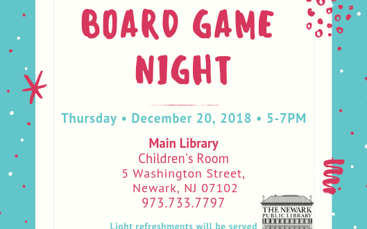 Join us at The Newark Public Library in the Children’s Room for a Board Game Night! Light refreshments will be served.