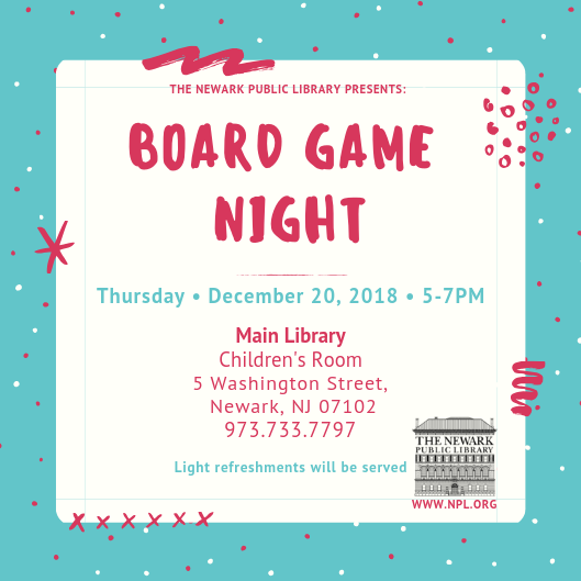 Join us at The Newark Public Library in the Children’s Room for a Board Game Night! Light refreshments will be served.