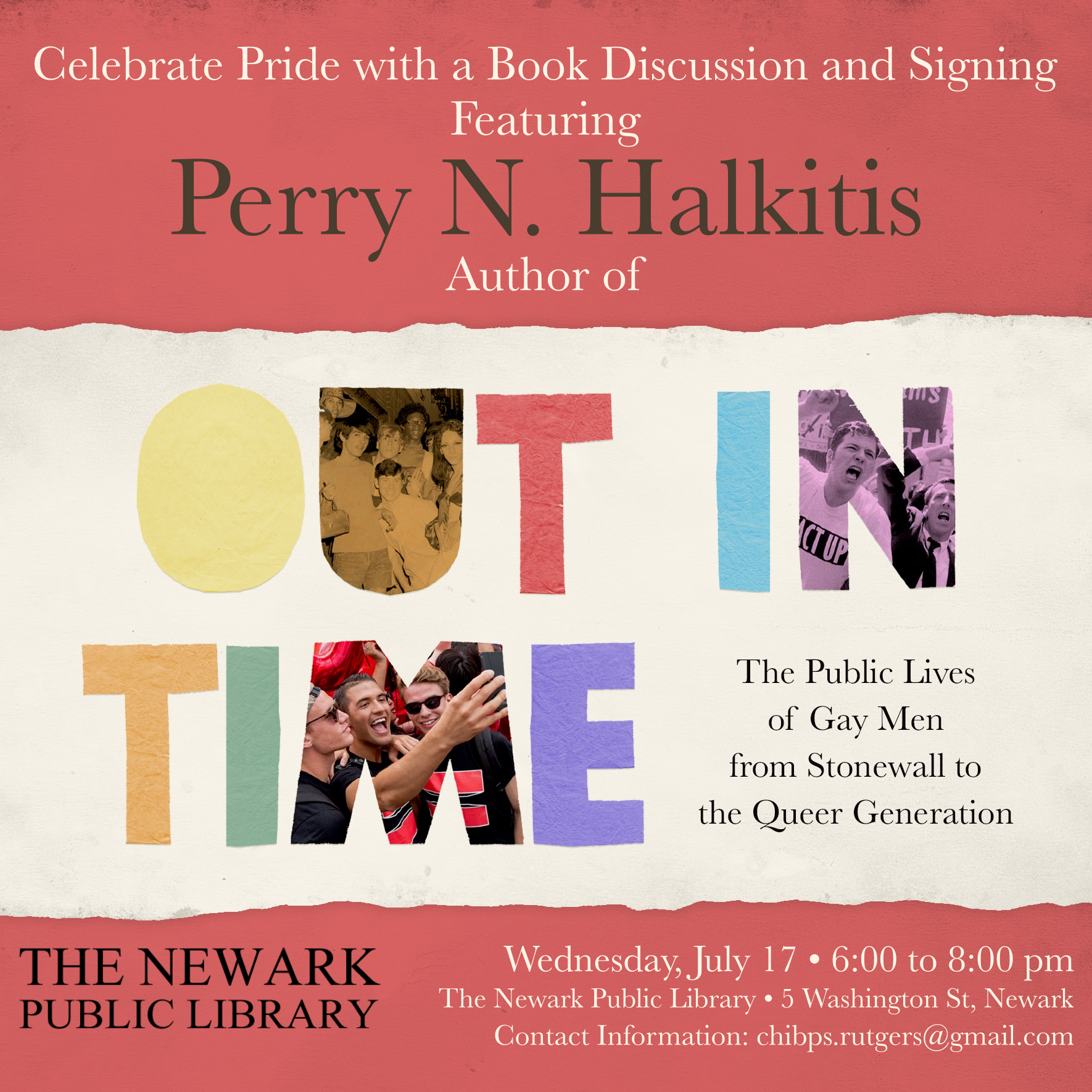 Join us in the 1st Floor LGBTQ Community Center for a Book Discussion and Signing to Celebrate Newark Gay Pride. Perry N. Halkitis, Author of Out in Time, will be at NPL to discuss his book, which touches on The Public Lives of Gay Men from Stonewall to the Queer Generation.