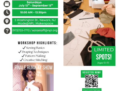 Teens in Stitches Sewing Workshop Saturdays | July 12th – September 13th 10:00 AM – 12:30pm 5 Washington St., Newark, NJ Made@NPL: Makerspace Contact: (973)733-7772... Read More