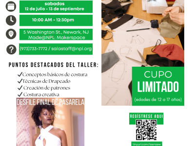 Jóvenes entre agujas taller de costura sabados | 12 de julio – 13 de septiembre 10:00 AM – 12:30pm 5 Washington St., Newark, NJ Made@NPL:... Read More