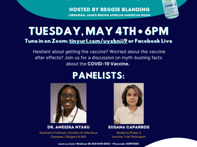 Tuesday, May 4th | 6:00 PM Tune in on Zoom: tinyurl.com/uyzbnjj9 or Facebook Live Join Reggie Blanding, Librarian, James Brown African American Room for COVID-19 Vaccine:... Read More