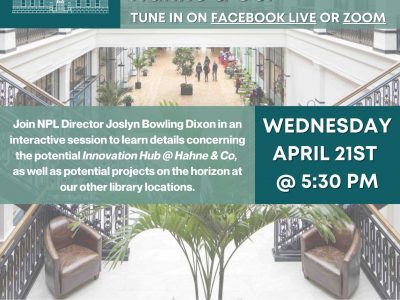 Please note: NPL’s Director, Joslyn Bowling Dixon, is postponing tonight’s town hall meeting. As you may have heard, the Clinton Branch will be closed until... Read More