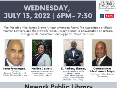 The Friends of the James Brown African American Room, The Association of Black Women Lawyers and the Newark Public Library present a conversation on arrests,... Read More