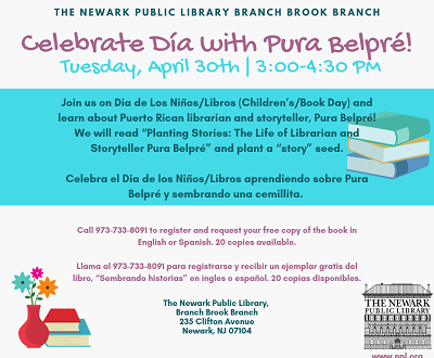 Join us on Dia de Los Niños/Libros (Children’s/Book Day) and learn about Puerto Rican librarian and storyteller, Pura Belpré! We will read “Planting Stories: The Life of Librarian and Storyteller Pura Belpré” and plant a “story” seed. Call 973-733-8091 to register and request your free copy of the book in English or Spanish. 20 copies available.