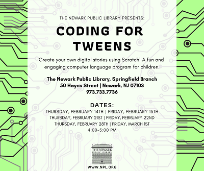 Join us at The Newark Public Library’s Springfield Branch for Coding for Tweens!
