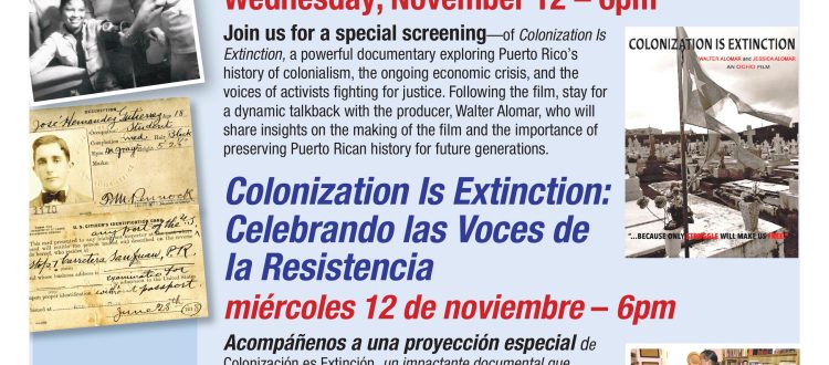 Join us for a special screening—of Colonization Is Extinction, a powerful documentary exploring Puerto Rico’s history of colonialism, the ongoing economic crisis, and the voices of activists fighting for justice. Following the film, stay for a dynamic talkback with the producer, Walter Alomar, who will share insights on the making of the film and the importance of preserving Puerto Rican history for future generations.
