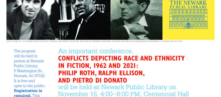 An important conference, Conflicts Depicting Race and Ethnicity in Fiction, 1962 and 2021: Philip Roth, Ralph Ellison, and Pietro di Donatowill be held at Newark Public Library on November 16, 4:00–8:00 PM, Centennial Hall Sponsored by the Philip Roth Personal Library and Seton Hall University, the event is inspired by a legendary 1962 symposium at Yeshiva University entitled A Study in Artistic Conscience: Conflict of Loyalties in Minority Writers of Fiction. Ralph Ellison, Philip Roth and Pietro di Donato addressed the topic. William J. Connell, La Motta Chair in Italian Studies, Seton Hall University, will present the first public airing of the tape, recently discovered in Yeshiva University’s Special Collections.