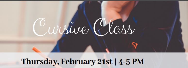 Children ages 6+ can learn the basics of cursive handwriting and can practice. Sheets for practicing at home will be provided. Part of the Van Buren Reading Club.