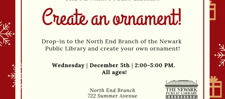 Join us on Wednesday December 5th for a drop-in craft at our North End Branch! From 2:00-5:00 we will have the supplies for you to create your own ornament. All ages welcome!