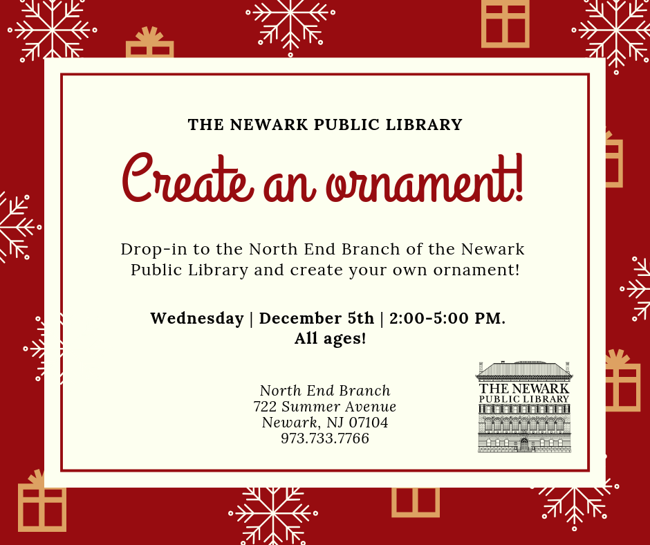Join us on Wednesday December 5th for a drop-in craft at our North End Branch! From 2:00-5:00 we will have the supplies for you to create your own ornament. All ages welcome!