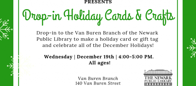 Drop-in to the Van Buren Branch of the Newark Public Library to make a holiday card or gift tag to celebrate all of the December Holidays!