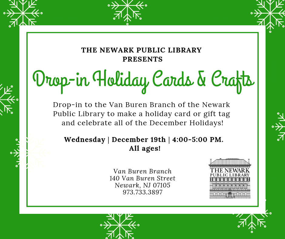 Drop-in to the Van Buren Branch of the Newark Public Library to make a holiday card or gift tag to celebrate all of the December Holidays!
