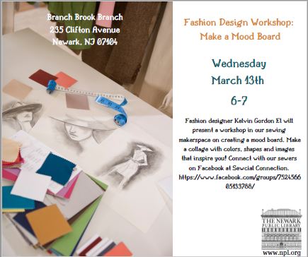 Fashion designer Kelvin Gordon El will present a workshop in our sewing makerspace on creating a mood board. Make a collage with colors, shapes and images that inspire you! Connect with our sewers on Facebook at Sewcial Connection. https://www.facebook.com/groups/752456605133788/