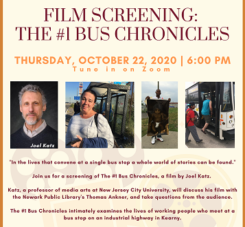 Join us for a screening of The #1 Bus Chronicles, a film by Joel Katz. Katz, a professor of media arts at New Jersey City University, will discuss his film with the Newark Public Library’s Thomas Ankner, and take questions from the audience. The #1 Bus Chronicles intimately examines the lives of working people who meet at a bus stop on an industrial highway in Kearny.
