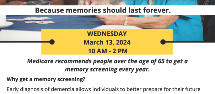 We will have 8 slots between 10 a.m. and 2 p.m. for people to get a memory screening from the Act Now Foundation. All people who hope to have a screening MUST REGISTER in advance.
