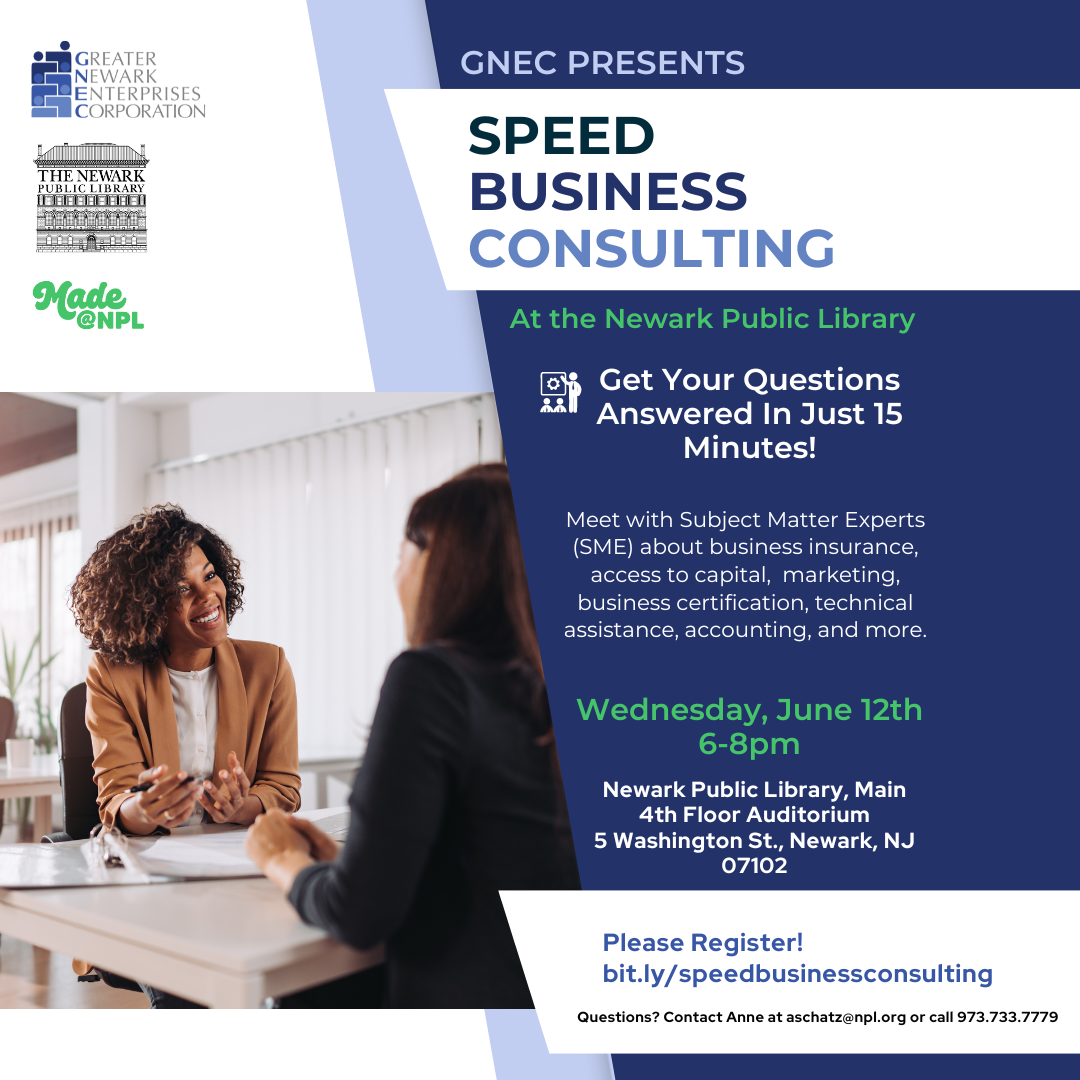 Get your business questions answered in 15 minutes with GNEC’s Speed Business Consulting at the Newark Public Library!