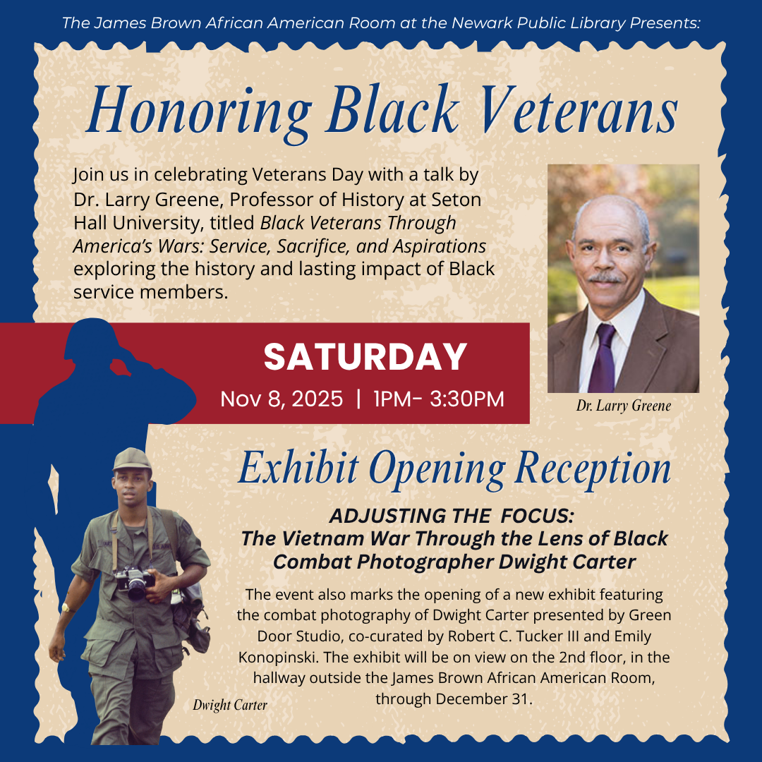 Join us for a special Veterans Day program at the library featuring a talk by Dr. Larry Greene, Professor of History at Seton Hall University. His talk, Black Veterans Through America’s Wars: Service, Sacrifice, and Aspirations, highlights the history, experiences, and lasting contributions of Black service members.