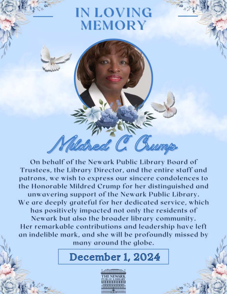 On behalf of the Newark Public Library Board of Trustees, the Library Director, the entire staff, and patrons, we extend our heartfelt condolences to the Honorable Mildred Crump, whose unwavering support of the Newark Public Library has left a lasting legacy. Her dedicated service enriched the lives of Newark residents and inspired the library community worldwide. Her remarkable contributions will be deeply missed and forever remembered. 🕊️