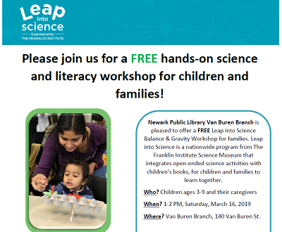 Newark Public Library Van Buren Branch is pleased to offer a FREE Leap into Science Balance & Gravity Workshop for families. Leap into Science is a nationwide program from The Franklin Institute Science Museum that integrates open-ended science activities with children’s books, for children and families to learn together. For Children ages 3-9 and their caregivers