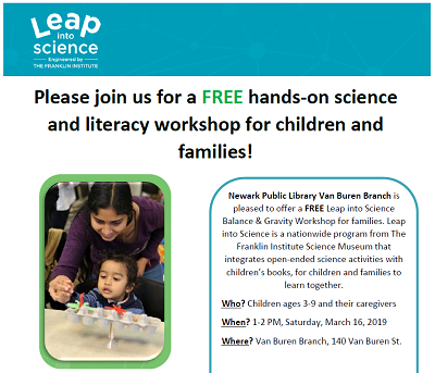 Newark Public Library Van Buren Branch is pleased to offer a FREE Leap into Science Balance & Gravity Workshop for families. Leap into Science is a nationwide program from The Franklin Institute Science Museum that integrates open-ended science activities with children’s books, for children and families to learn together. For Children ages 3-9 and their caregivers