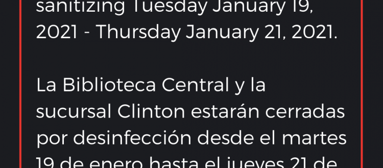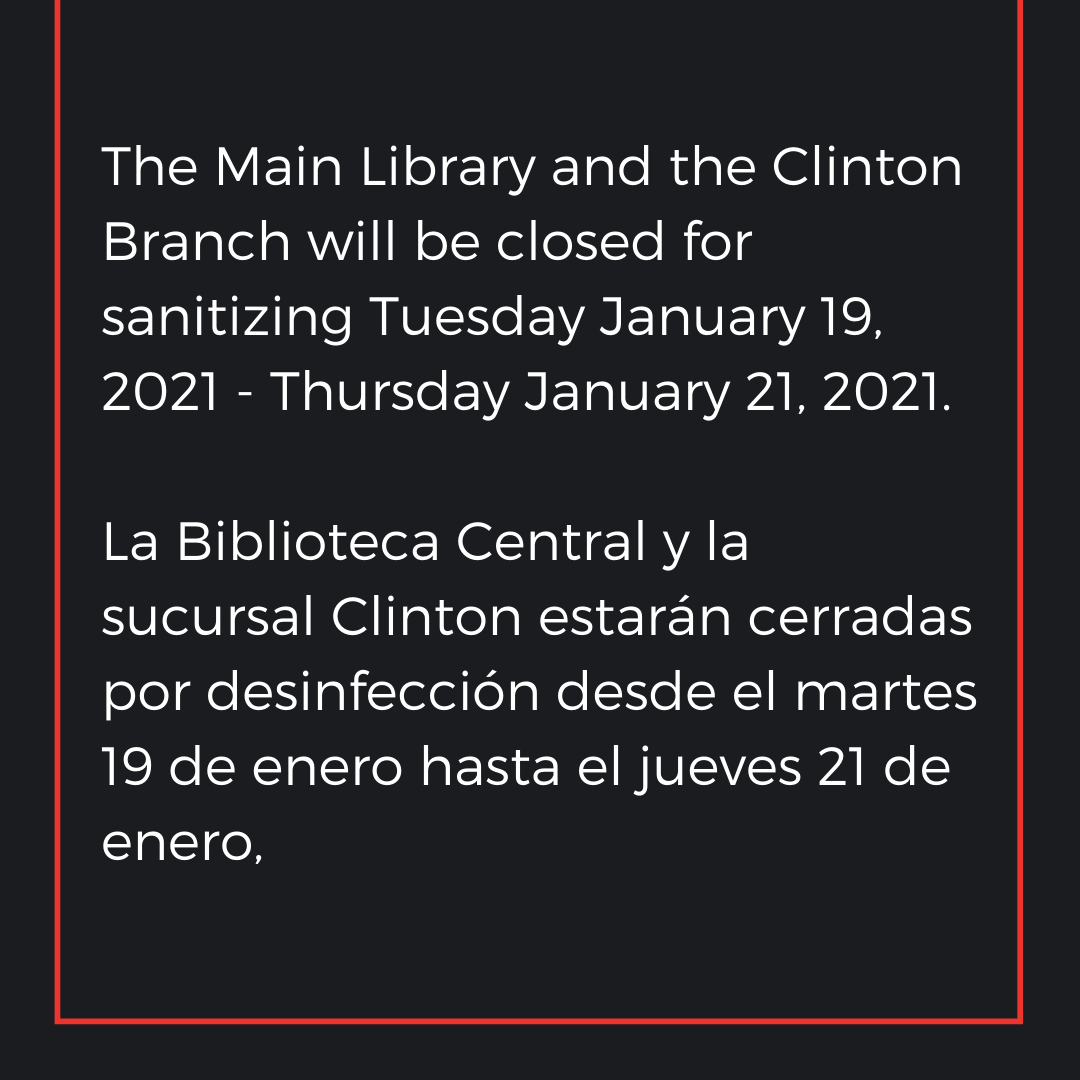 La Biblioteca Central y la sucursal Clinton estarán cerradas por desinfección desde el martes 19 de enero hasta el jueves 21 de enero, a raíz de dos casos positivos de Covid-19. Todas las demás sucursales abrirán según lo programado el martes 19 de enero. La Biblioteca Central y la sucursal Clinton reabrirán el viernes 22 de enero.
