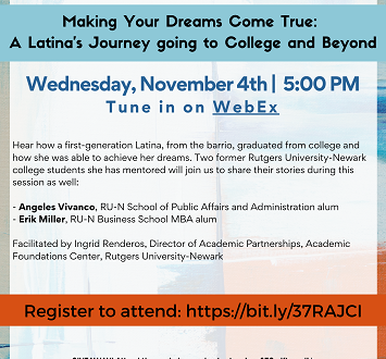 Hear how a first-generation Latina, from the barrio, graduated from college and how she was able to achieve her dreams. Two former Rutgers University-Newark college students she has mentored will join us to share their stories during this session as well: