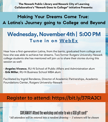 The Newark Public Library and Newark City of Learning Collaborative’s “Newark Goes to College” initiative Presents: Making Your Dreams Come True: A Latina’s Journey going to College and Beyond