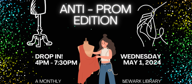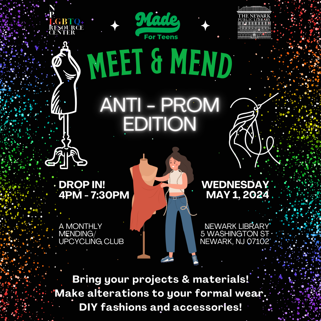 Join us for a special Anti-Prom Edition of Meet & Mend. We’re inviting teens to embellish, upcycle, and alter their garments for the Newark Public Library’s Anti-Prom on June 1st.