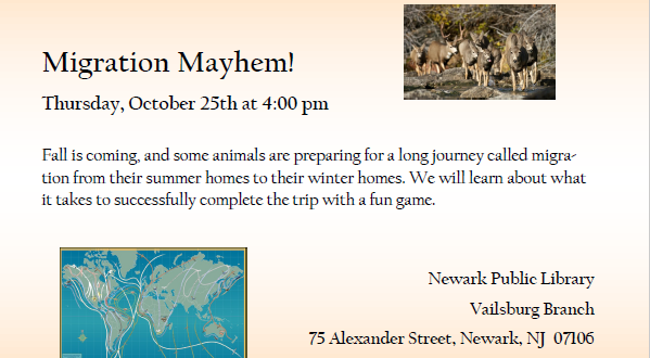 Join us on Thursday, October 25th for Migration Mayhem! Fall is coming, and some animals are preparing for a long journey called migration from their summer homes to their winter homes. We will learn about what it takes to successfully complete the trip with a fun game.
