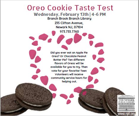 Did you ever eat an Apple Pie Oreo? Or Chocolate Peanut Butter Pie? Ten different flavors of Oreos will be available for you to try. Then vote for your favorite! Teen Volunteers will receive community service hours for helping out.