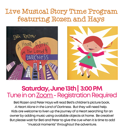 Saturday, June 13th | 3:00 PM Tune in on Zoom Beti Rozen and Peter Hays will read Beti’s children’s picture book, A Heart Alone in the Land of Darkness. But they will need help. Kids are welcome to liven up the journey of a Heart searching for an owner by adding music using available objects at... Read More