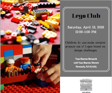 Saturday, April 13th, 2019 | 12:00-1:00 PM The Newark Public Library, Van Buren Branch| 140 Van Buren Street, Newark, NJ 07105 Children 4+ can make creative projects out of Legos based on design challenges. Please click here to view the flyer.