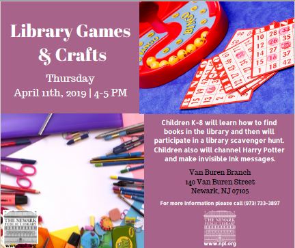Thursday, April 11th | 4-5 PM Newark Public Library, Van Buren Branch|140 Van Buren Street, Newark, NJ 07105 Children K-8 will learn how to find books in the library and then will participate in a library scavenger hunt. Children also will channel Harry Potter and make invisible Ink messages. Please click here to view the... Read More