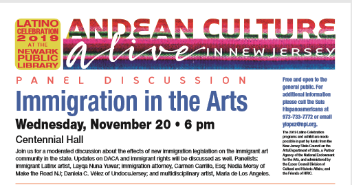 Immigrants have always been the lifeblood of New Jersey. They’ve expanded our labor force, enriched our culture, seasoned our food, and breathed new life into the arts. Join us for a moderated discussion about the effects of new immigration legislation on the immigrant art community in the state. Updates on DACA and immigrant rights will be discussed as well. Panelists: Nedia Morsy of Make the Road NJ; Daniela C. Vélez of UndocuJersey; immigration attorney, Carmen Carrillo, Esq; multidisciplinary artist Maria de Los Angeles; and immigrant Latinx artist, Layqa Nuna Yuwar.