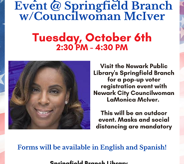 Visit the Newark Public Library’s Springfield Branch for a pop-up voter registration event with Newark City Councilwoman LaMonica McIver.