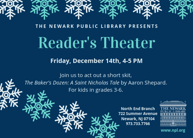 Join us at The Newark Public Library on Friday, December 14th from 4-5 PM where will act out a short skit of the book The Baker’s Dozen: A Saint Nicholas Tale by Aaron Shepard. For kids in grades 3-6.