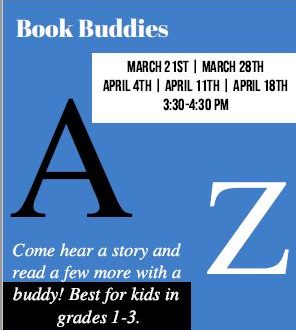 Come hear a story and read a few more with a buddy! Best for kids in grades 1-3.