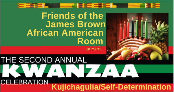 The Friends of the James Brown African American Room present its Second Annual Kwanzaa Celebration! Join us for arts and crafts for children and families from 4-6 PM, and a Kwanzaa quiz, performance by Zawadi African Dance & Drum, Inc., and a ceremonial candle lighting from 6-8 PM