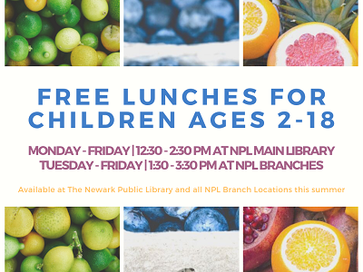 /Past Exhibits and Events Free Lunches at NPL The Newark Public Library – Main Library and ALL NPL Branches Main Library: Monday through Friday | 12:30-2:30 PM NPL Branches: Tuesday through Friday | 1:30-3:30... Read More