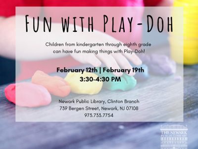 /Past Exhibits and Events Fun with Play-Doh Tuesdays, February 12th & February 19th | 3:30-4:30 PM Newark Public Library Clinton Branch | 739 Bergen Street, Newark, NJ 07108 Children from Kindergarten through... Read More
